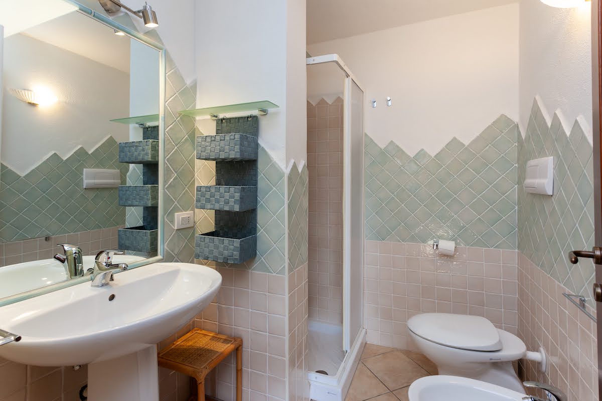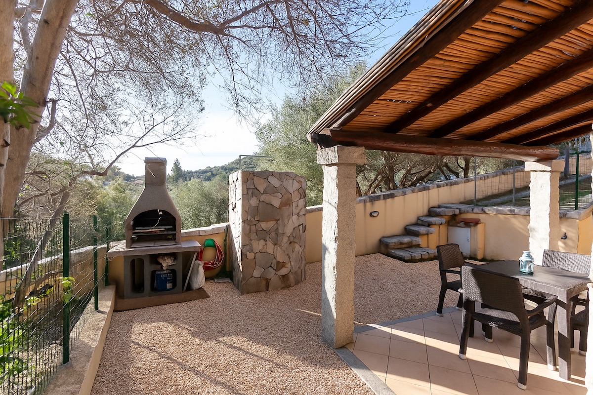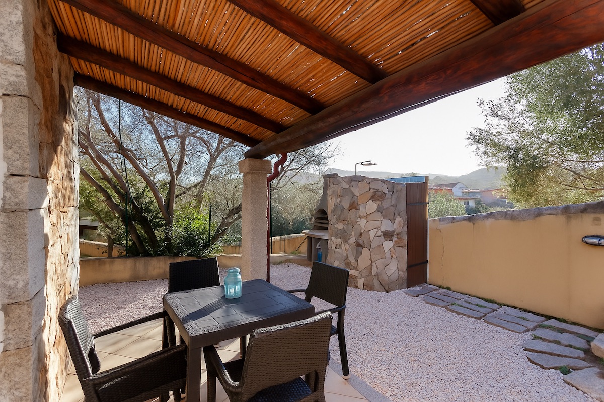 All’esterno, una piacevole veranda vi invita a momenti di tranquillità, arricchita da una splendida doccia in pietra sarda e da un pratico barbecue in muratura, ideale per grigliate all’aria aperta.